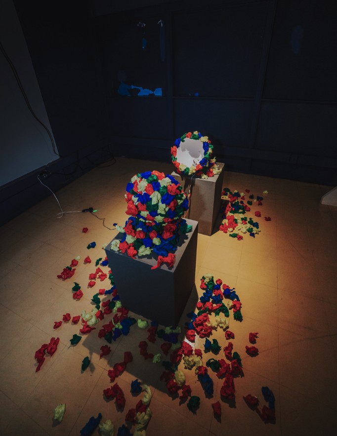 Técnica: Dispositivos eletrônico-digitais, bola de isopor, papel crepom, áudio arquivos mp3.